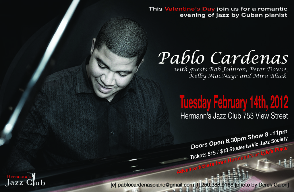 Tue. February 14th 2012 20:00 - 23:00 doors at 18:00 (All Ages) Pablo Luis Cardenas is a pianist with the ability to play in a multitude of styles each with enthusiasm, skill and finesse. He has a charisma and charm that both intrigues and entertains his audience.
