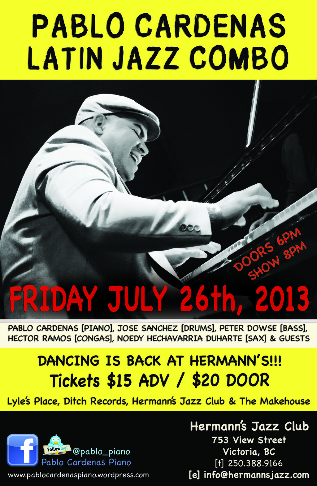 Fri. July 26th 2013 20:00 - 23:00 doors at 18:00 (All Ages) PABLO CARDENAS LATIN JAZZ COMBO is back at Hermann's! It's been a while now.. and you may have caught them tearing up the main stage at Jazz Fest! Now it's time to come and see them in a more intimate environment...
