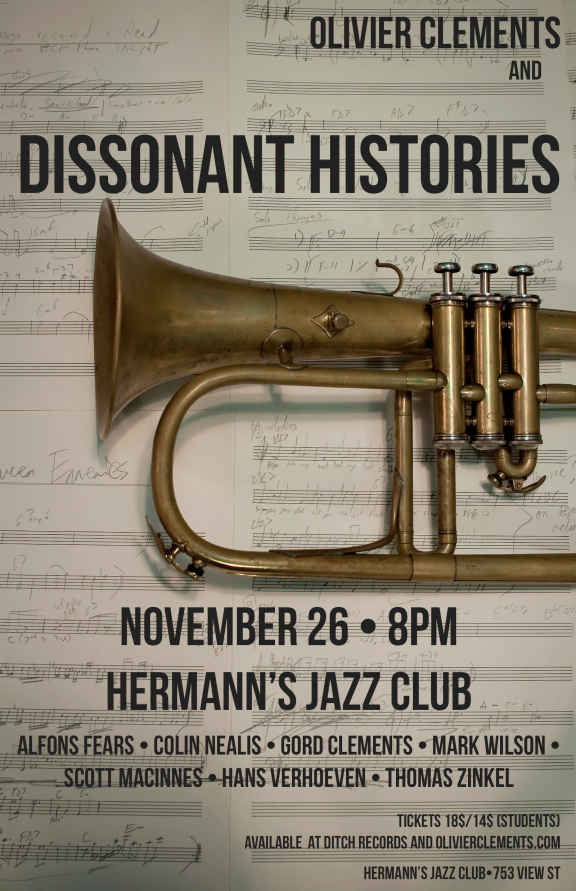 Tue. November 26th 2013 8pm - 11pm doors at 8pm (All Ages) Dissonant Histories is an Octet of clashing, dismembered musical styles. Recklessly colliding jazz, hiphop, indie rock and classical music, the ensemble creates a voiceless entity that laments its tormented past.