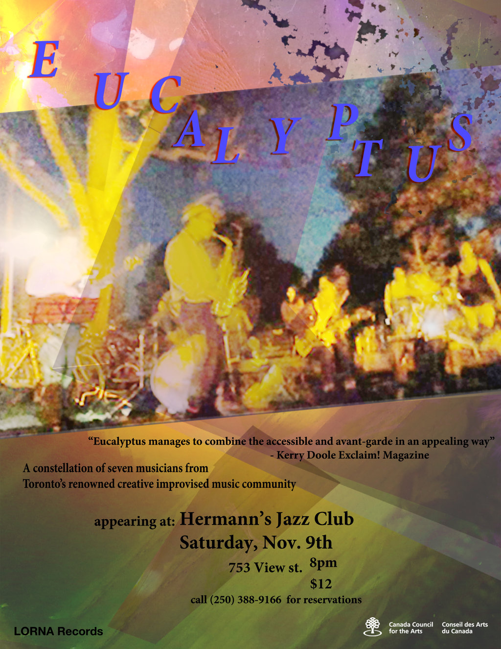 Sat. November 9th 2013 8pm - 11pm doors at 6pm (All Ages) Eucalyptus is a seven piece instrumental ensemble from Toronto, Ontario. The group plays original jazz compositions by renowned alto-saxophonist Brodie West. Incorporating aspects of music from Mali, Sierra Leone, Algeria and The Caribbean their adventurous sound blurs the line between dance music and the avant-garde. West’s compositions are rich with languid rhythms, lyrical melodies, syncopated horn lines and intricate ensemble interplay.