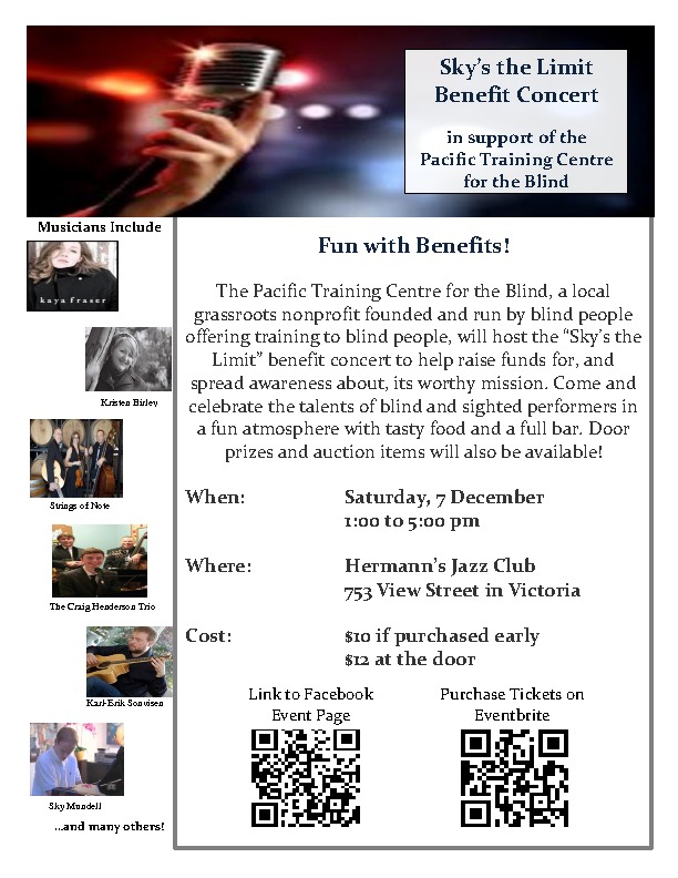 Mark your Calendars! The Pacific Training Centre for the Blind will be hosting the “Sky’s the Limit” benefit concert to help raise funds for, and spread awareness about, its worthy mission. Come and celebrate the talents of blind and sighted performers in a fun atmosphere with tasty food and a full bar.
