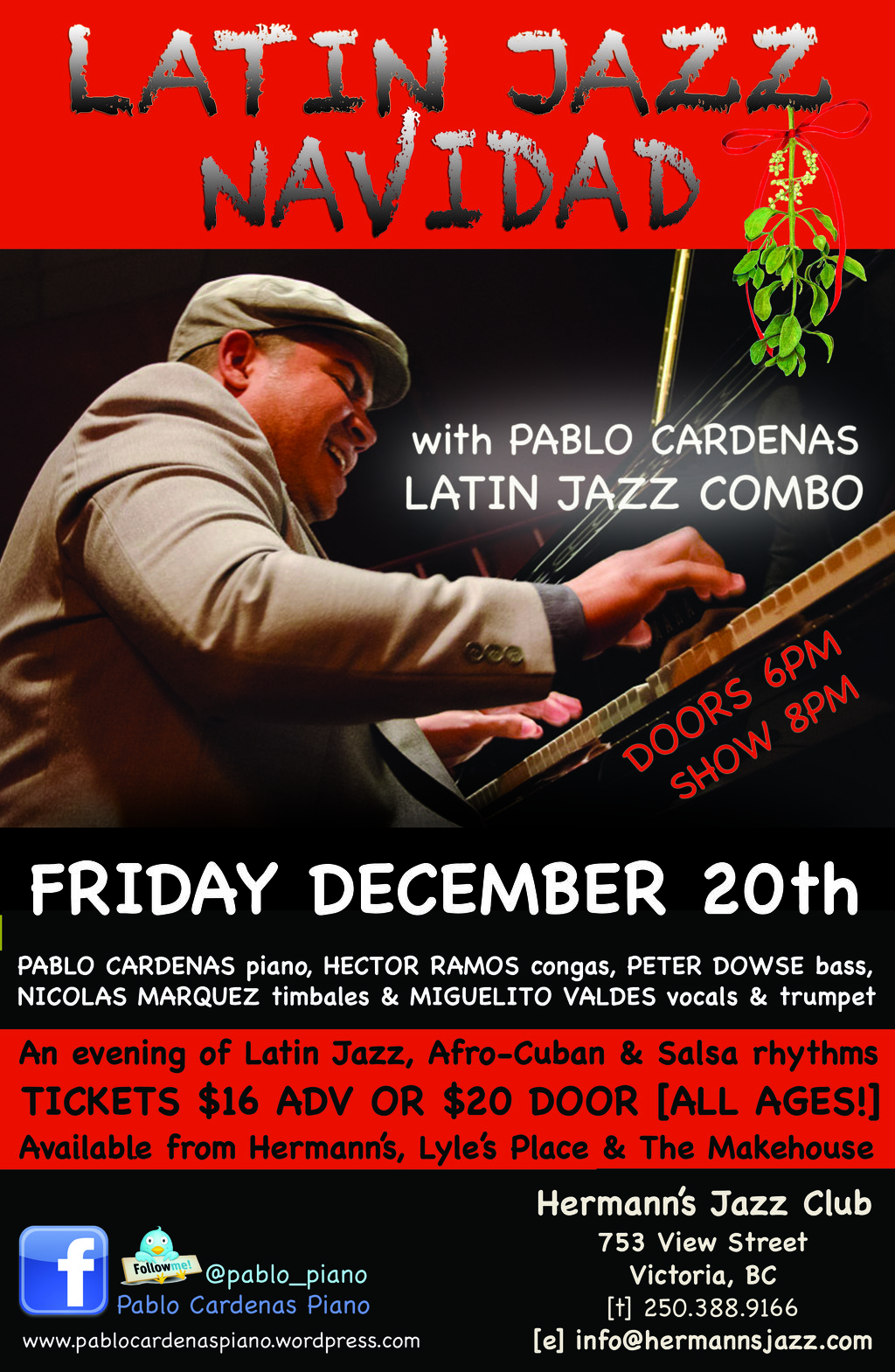 Fri. December 20th 2013 20:00 - 24:00 doors at 18:00 (All Ages) Join us at Hermann's this holiday season for an evening of Latin Jazz and Afro-Cuban rhythms with Pablo Cardenas and his Latin Jazz Combo.