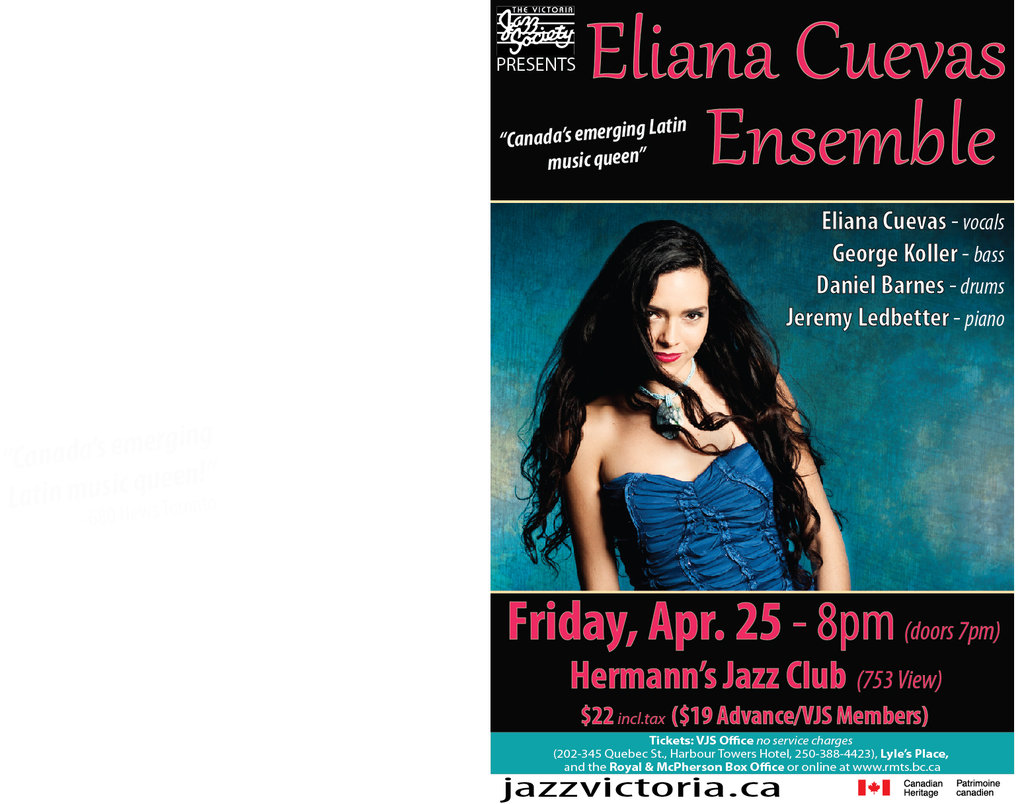 Her newest album Espejo (2013) is a true testament to Cuevas' growth as an artist. Espejo seamlessly blends genres from blues to pop with Cuevas’ signature soaring vocals and Latin jazz sound. Welcome Eliana Cuevas back to Victoria with her outstanding ensemble George Koller bass, Daniel Barnes drums and Jeremy Ledbetter piano