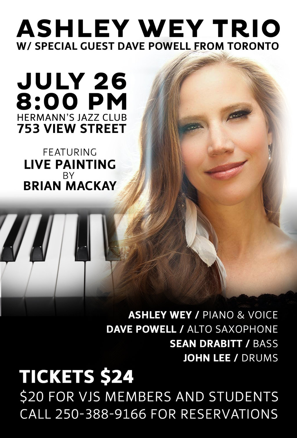 For this one special evening, the Ashley Wey Trio will be performing with a Saxophone/ Pianist from Toronto, Dave Powell. He is a downbeat award winning Saxophonist who's brilliance will blow you away. There will also be a painting finished with each set of music by Point Blank Paint-off Competition Champion Brian MacKay, that will be auctioned off throughout the evening. It's a one time special event.