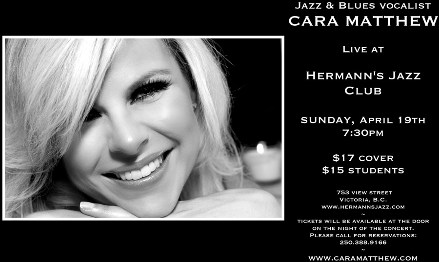 Sun. April 19th 2015 7:30PM - 10:30PM doors at 6:30PM (All Ages) $17 - cover $15 - students Jazz and Blues vocalist Cara Matthew live at Hermann's Jazz Club. She will be supported by pianist Attila Fias from Toronto, and by Victoria's own talents.