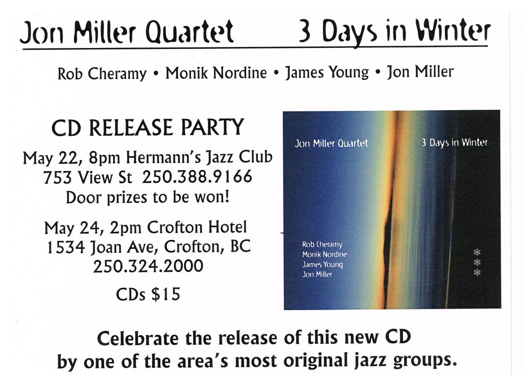 Announcing the release of a new full length recording by one of the BC’s premiere instrumental jazz groups. Jon Miller Quartet's "Three Days in Winter" was recorded in three sessions this past December and February and features nine original jazz compositions by band members Miller, Rob Cheramy, Monik Nordine and James Young. Produced by Jon Miller and engineered by Brent Jarvis at Habourview Studio, Esquimault BC. Jacket design by Victoria artist and musician Doug Galbraith. Photos by Brad Yamenech and Samantha Hill.