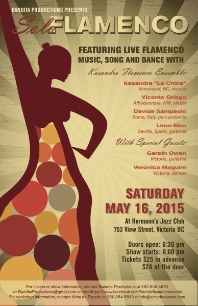 Kasandra Flamenco is coming to our town! With Vicente Griego of Albuquerque, Liron Man of Sevilla, Davide Sampaolo Percussion of Rome, and Victoria's own Gareth Owen Flamenco Guitarist and Veronica Maguire of Alma de España Flamenco Dance Company & School.