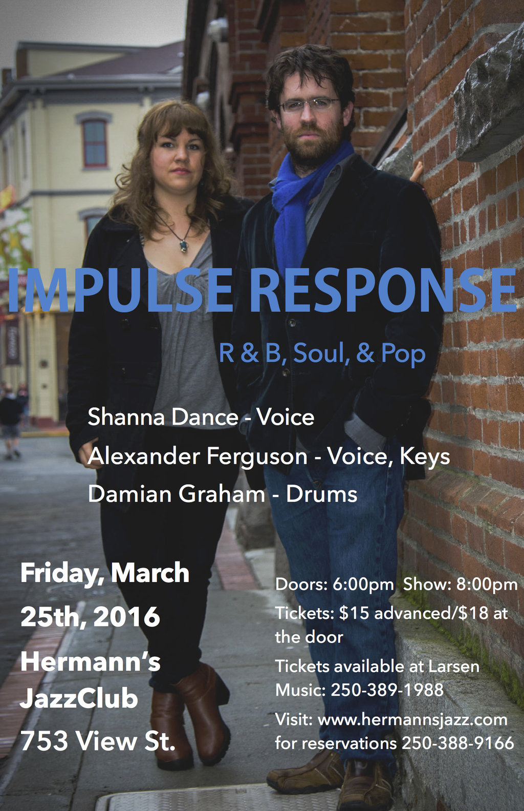 Impulse Response is Victoria’s newest soul, groove, and R&B trio. The group is small with a big sound. Shanna and Alexander front the band as lead vocalists. With tight and punchy grooves, their sound is infused with sweet and soulful harmonies. The bands influences include: Soulive, Aretha Franklin, Bill Withers, The Meters, Herbie Hancock, Justin Timberlake, Donny Hathaway, Joss Stone, John Mayer Trio, D’Angelo, Michael Jackson, Lauryn Hill, Stevie Wonder, Alicia Keys, Marvin Gaye, and Ray Charles. This group is comprised of talented musicians who have played at such venues as: Hermanns Jazz Club, Swans, Bartholomew’s, Canoe Club, Vista 18, Darcy’s, My Bar and Grill, The Oswego Hotel, The Bengal Lounge, Garden City Grooves Festival, Victoria Jazz Society’s TD Jazz Fest and Blues Bash Festivals, and many more.