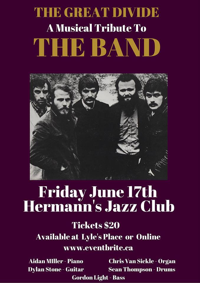 Fri. June 17th 2016 8:00pm doors at 6:00pm (All Ages) The Great Divide return to Hermann's and will again bring to life the music of The Band. Playing music from their entire catalogue, these nights are always memorable and fun. Please join us to celebrate the music of THE BAND and enjoy a great night at Hermann's Jazz Club.