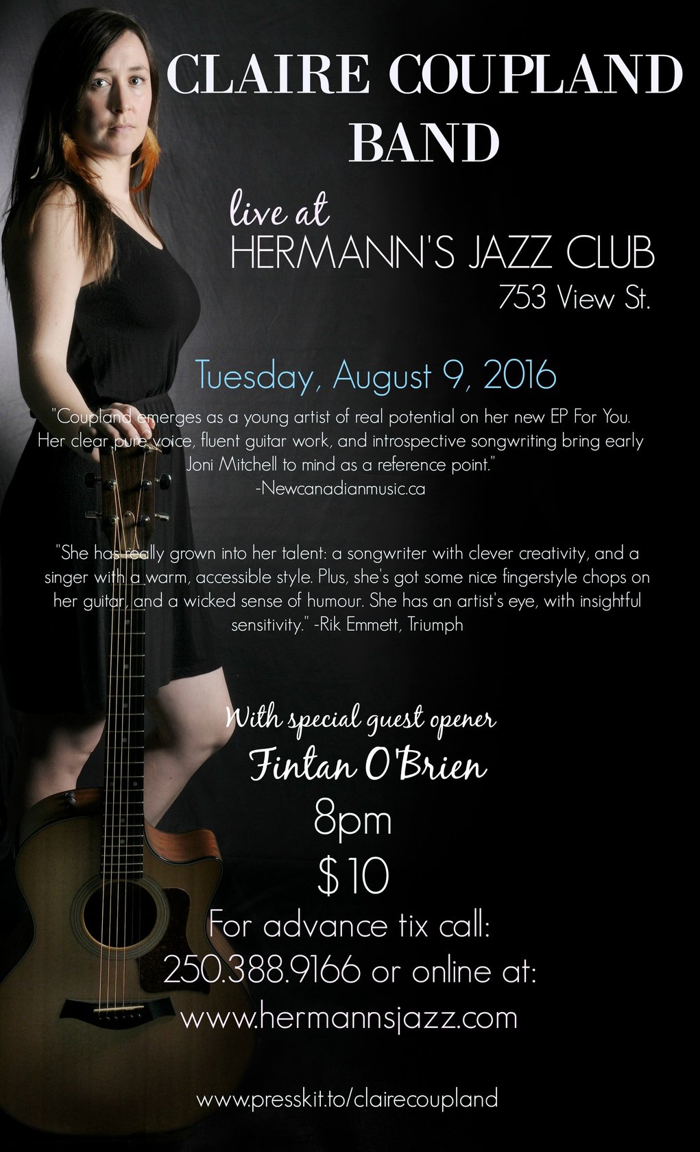 Don't miss out on this opportunity to see up and coming Canadian folk singer-songwriter Claire Coupland return to her hometown for a night of original music. She and her band of hand picked local Victoria musicians will play her original music which has been featured on college radio and CBC radio program "In The Key Of C", hosted by Craig Norris. Featuring songs from her album (Lonely Heart, 2014) and newest EP, For You (2015).