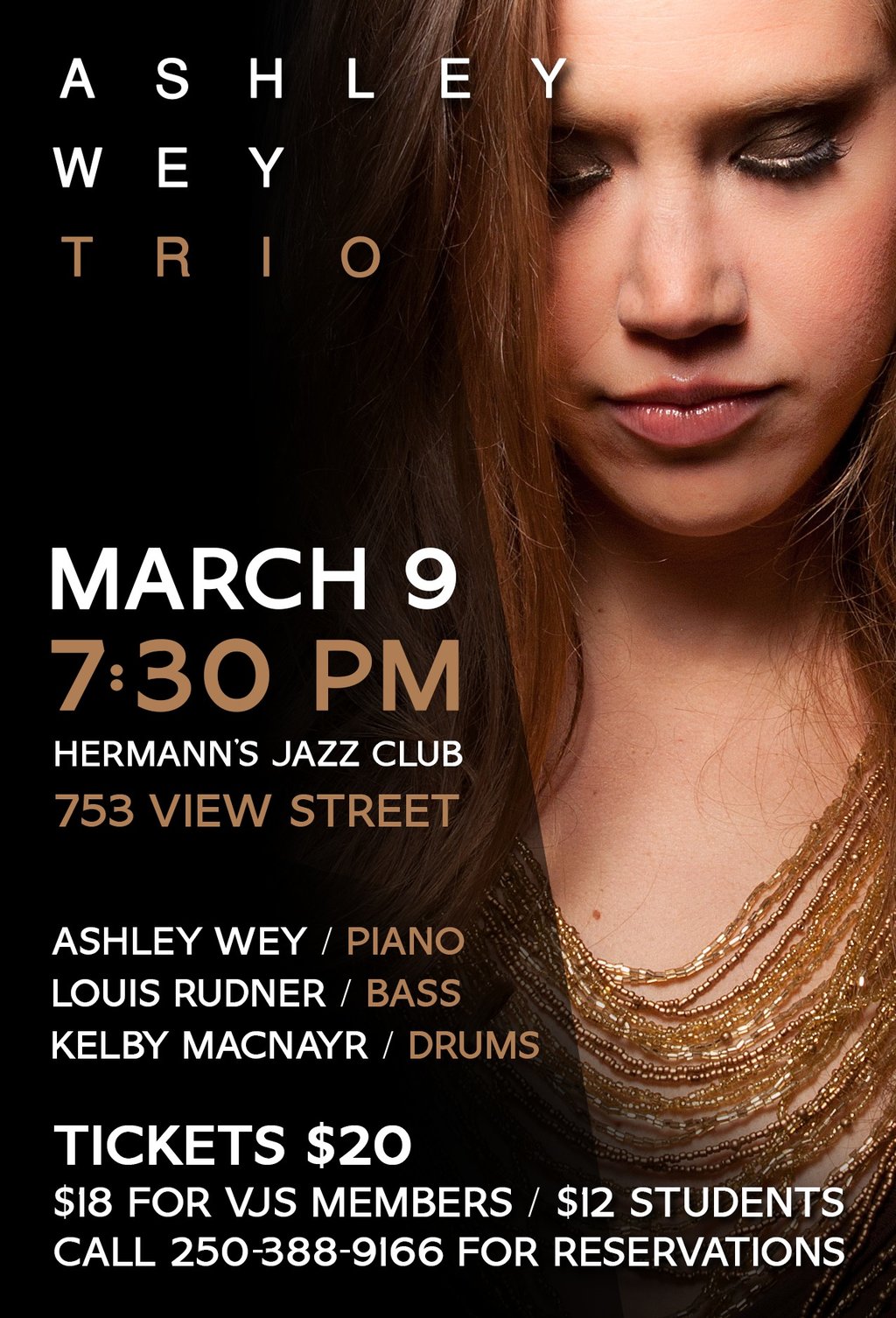 This show will showcase the Ashley Wey Trio featuring Louis Rudner on Bass from Michigan, USA and long time friend and colleague Kelby MacNayr on the drums.