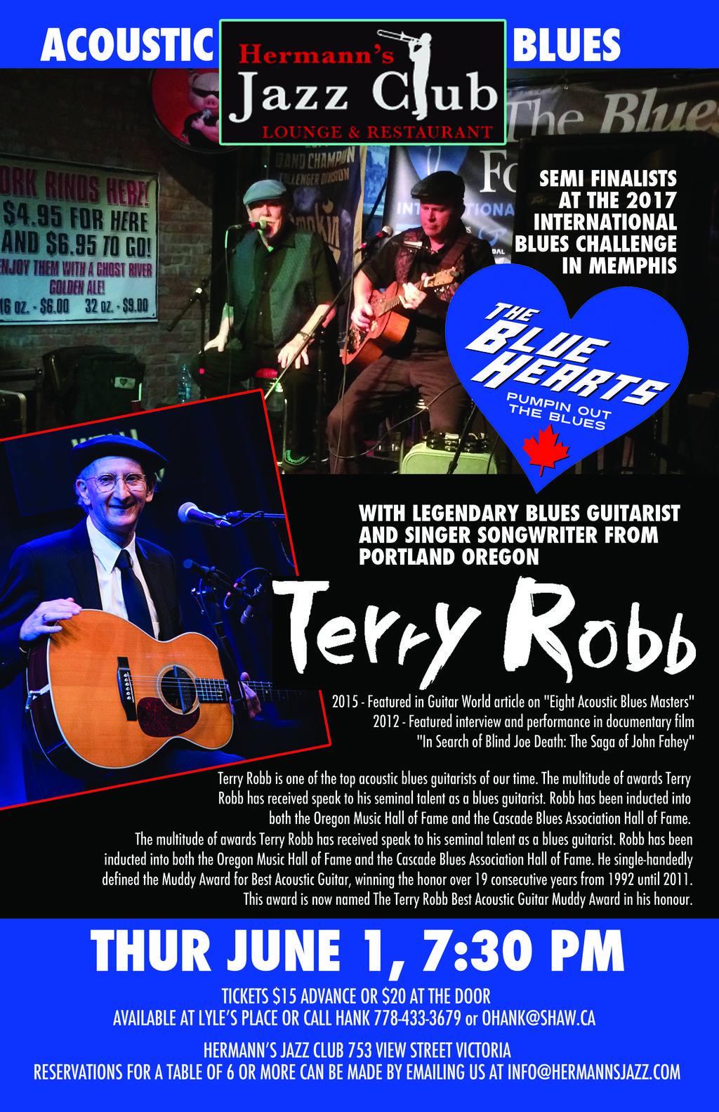 The Blue Hearts were semi finalists at the International Blues Challenge in Memphis this past February 2017 They are very excited to have Terry Robb as a Special Guest for this show. Terry Robb is one of the top acoustic blues guitarists of our time. His signature fingerpicking style has earned him international acclaim from worldwide audiences, music critics and his distinguished peers. Incorporating elements from the Mississippi Delta music tradition, ragtime, country, swing and free jazz, Robb has built a unique blues sound that has made him a legend in his over 40 year music career.