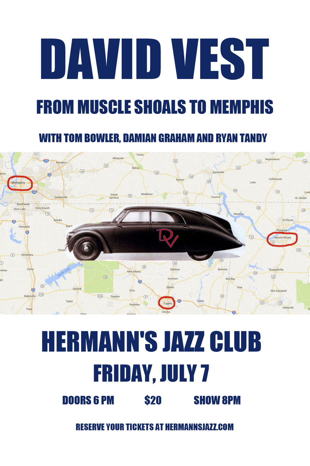 David and his band salute the Muscle Shoals Swampers and the titans of Memphis soul. Featuring Ryan Tandy, - solid bass, Damian Graham - creative drumming, Tom Bowler - tasteful guitar.