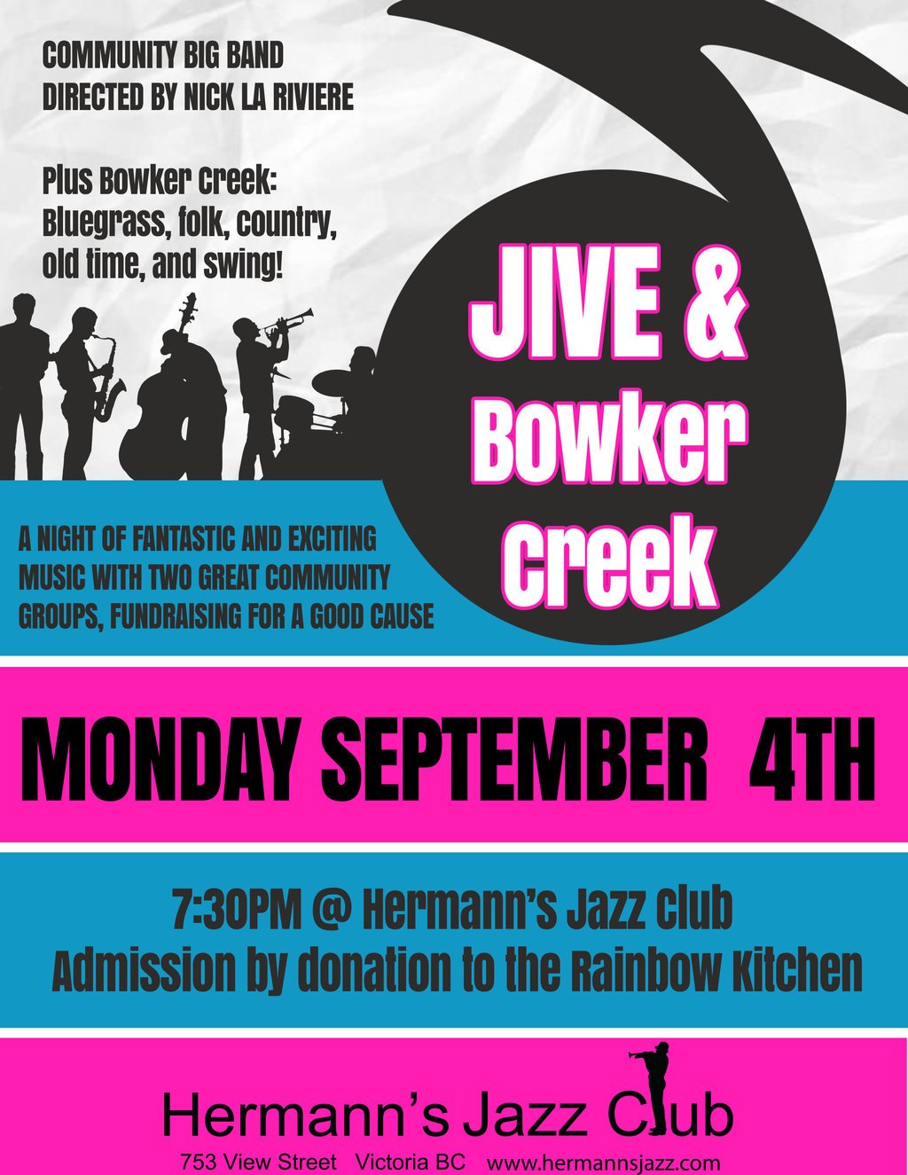 Trombonist Nick La Riviere’s community big band, JIVE (the Jazz In Victoria Ensemble) performs a mix of swing dance classics, traditional big band hits, and even a little disco. The 18 piece band features the sultry vocals of Bob Nelson, and is guaranteed solid entertainment. Opening for Jive is Bowker Creek. This bluegrass band features Bonnie Jean Duncan on guitar & vocals, Duncan Sutherland on guitar & vocals, John Cornes on bass & vocals, Danny Ready on mandolin & guitars, and Doug VanDine on Banjo. The band has played together since 2009 and been a hit at various music festivals - and even opened for Fred Penner. Admission is by donation to The Rainbow Kitchen, so come on out for some good tunes and support a good cause!