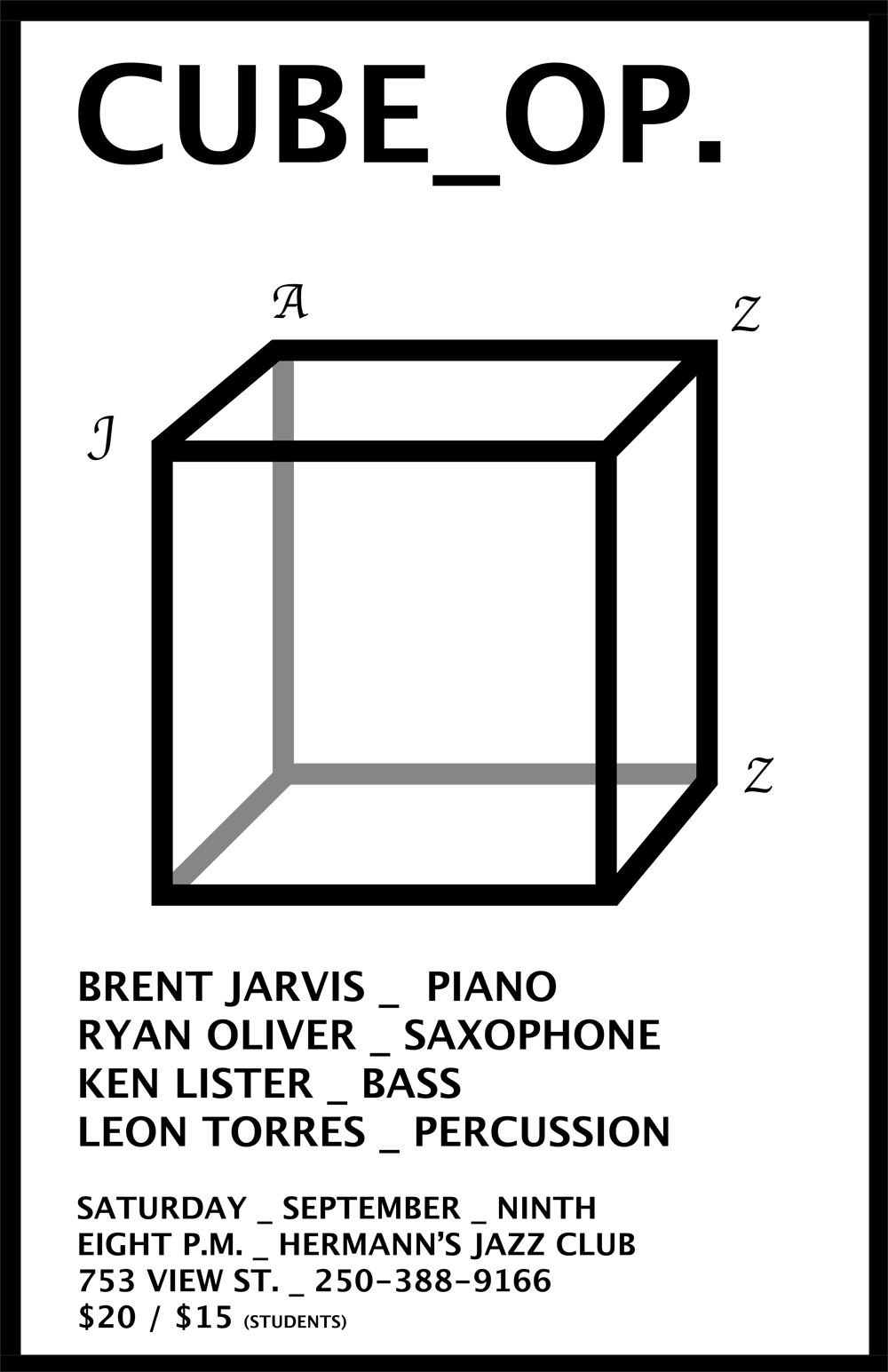 Brent Jarvis leads this group he calls CUBE_OP. featuring Ryan Oliver-saxes, Ken Lister-bass and Leon Torres-percussion.