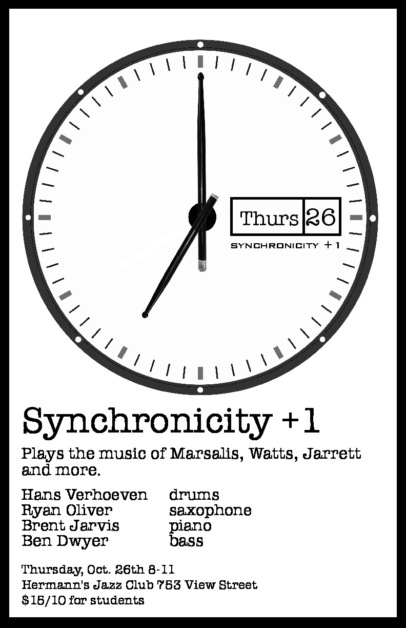 Synchronicity + 1: Hans Verhoeven (Drums), Ryan Oliver (Saxophones), Brent Jarvis (Piano), Ken Lister, (Bass)