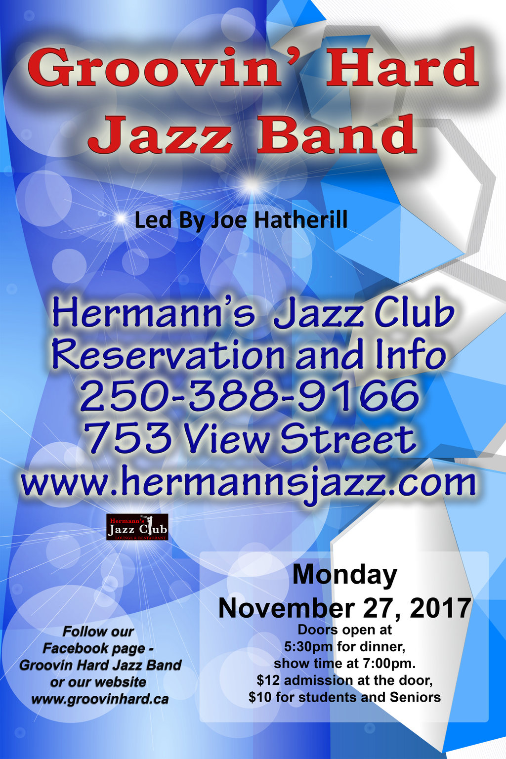 Groovin Hard: By popular request, 'Groovin Hard' returns to Hermann's on Monday, November 27. Playing a variety of big band and jazz arrangements, this energetic 16-piece band, is joined by our new vocalists, Emily, Elizabeth and Tyson! Led by our Musical Director Joe