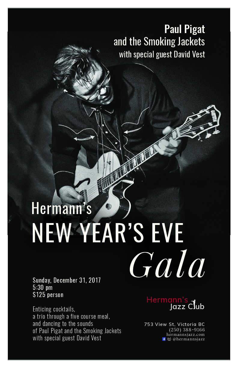 Sun. December 31st 2017 5:30pm doors at 5:30pm (All Ages) Trio for cocktails and a 5 course meal featuring an exciting New Years Eve Menu prepared by our Chef..and dancing to the sounds of Paul Pigat and the Smoking Jackets with Al Pease and special Guest David Vest..bringing in the New Year with champagne....an elegant exciting evening one not to be missed!