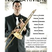 The Nick La Riviere Band blows the room away with its powerful horns, talented soloists, and energetic tunes. The band performs originals as well as unique versions of tunes by everyone from Professor Longhair to Sly and the Family Stone. The 7 piece band features 3 horns, 3 singers, piano/synth, guitar, bass, drums, and some unusual instruments including conch shells and wine glasses. The memorable show is full of variety and fun.