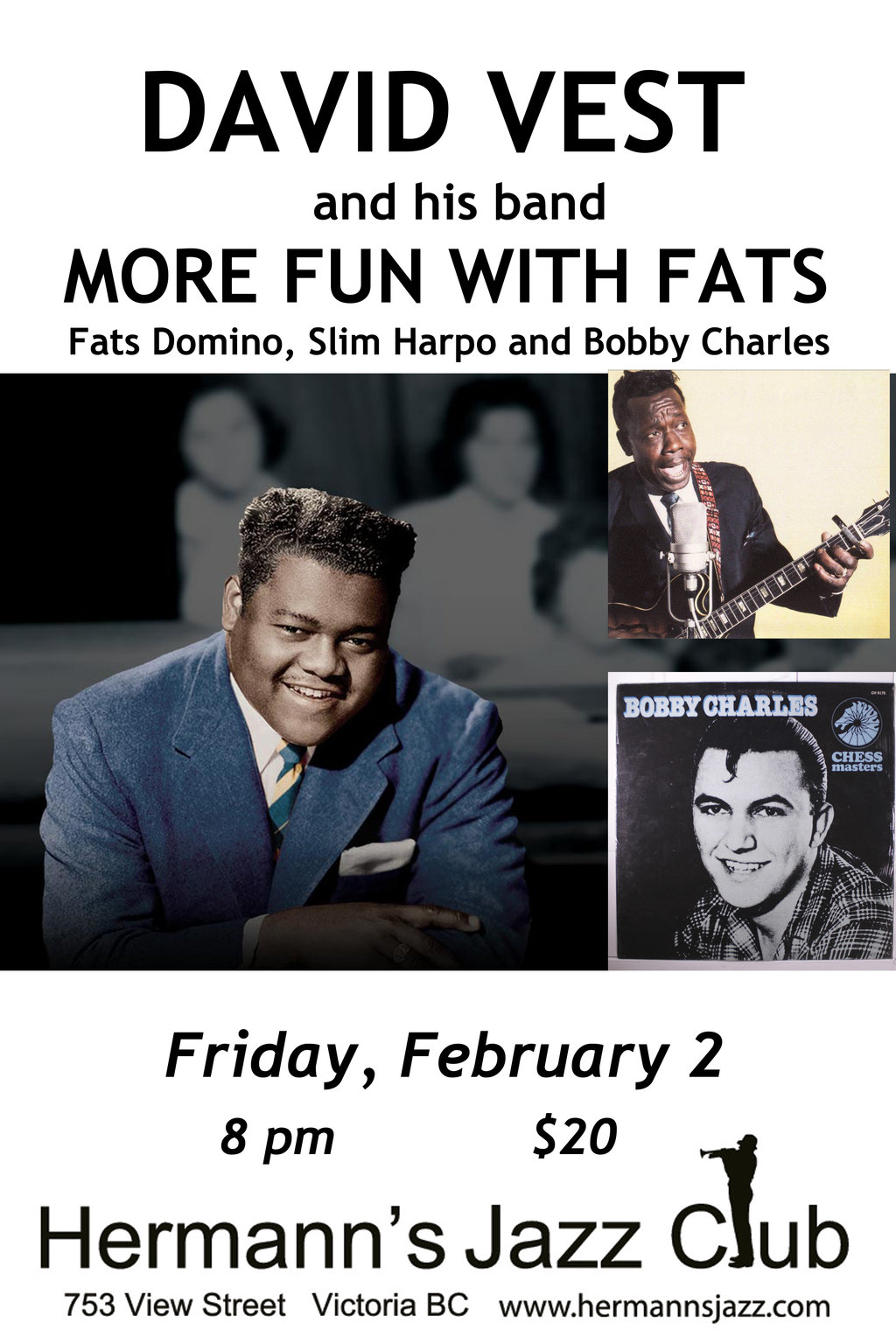 Fri. February 2nd 2018 8pm doors at 6pm (All Ages) David and his band played an all-Fats Domino show last December, but there is plenty of music by the Fat Man that they didn’t get around to playing. They’ll also play songs by Bobby Charles, who wrote hits for Fats as well as for Bill Haley and the Comets. And there’s no more earthy and elemental blues sound than the songs off Slim Harpo — Raining In My Heart, I’m A King Bee, Shake Your Hips, etc. His band for this show includes Damian Graham, Ryan Tandy, Tom Bowler — and possibly a mystery guest.