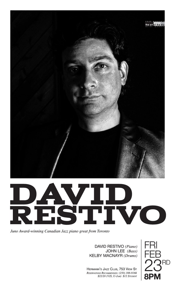 David Restivo Trio: A very special presentation of the Art of the Trio Series featuring Juno Award-winning, Three-time National Jazz Award winning pianist David Restivo with bassist John Lee and drummer Kelby MacNayr.
