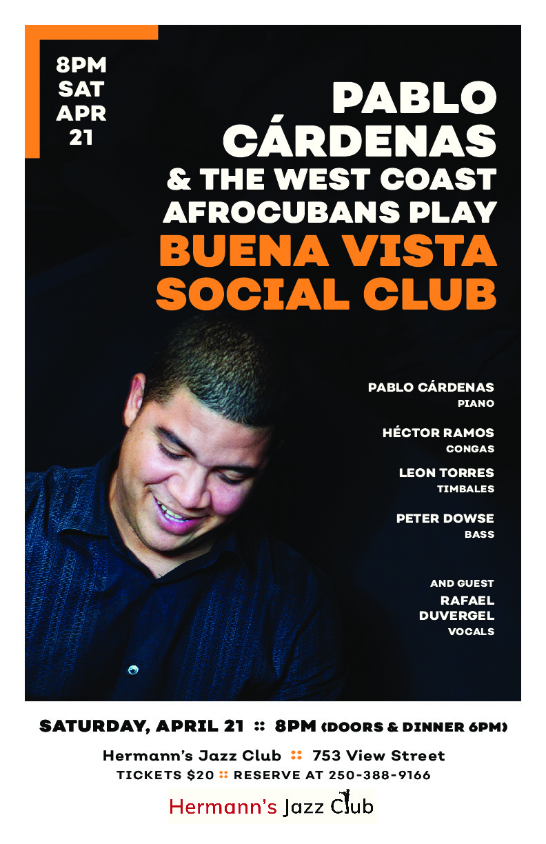 Sat. April 21st 2018 8pm doors at 6pm (All Ages) Pablo Cardenas and The West Coast afrocubans will be playing a tribute to Buena Vista Social Club on April 21st at Hermann's Jazz Club, on Victoria , BC. On the line up will be an all stars selection of musicians from Cuba that include Hector Ramos on the congas, Leon Torres on Timbales, Peter Dowse on bass, Rafael Duvergel on vocals, and Pablo Cardenas on piano and musical direction. Tickets $20 at doors, show start 8pm, doors open 6pm reserve at 250-388-9166.