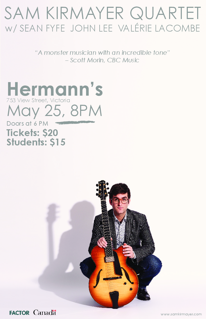 Sam Kirmayer is a guitarist and composer based in Montreal. Inspired by masters like Wes Montgomery and Grant Green, Sam maintains firm roots in the blues and hard bop traditions. He was included in CBC Music's list of “The 35 Best Canadian Jazz Musicians Under 35”. Sam’s first tour of Canada’s west coast follows up on the 2017 release of his debut recording, Opening Statement. With Sean Fyfe (piano), John Lee (bass) and Valérie Lacombe (drums).