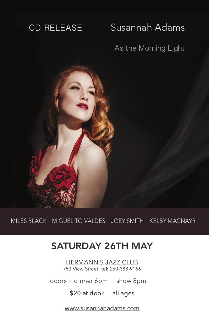 Susannah Adams CD Release As the Morning Light: Miles Black . (piano), Miguelito Valdes (trumpet), Joey Smith (double bass) and Kelby MacNayr (drums)