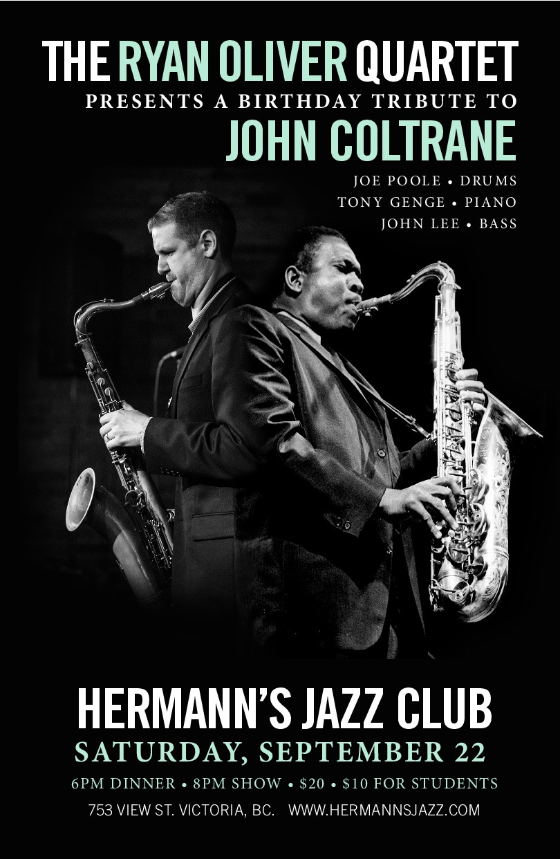 Tough toned, Juno-nominated saxophonist Ryan Oliver honed his craft living on Canada’s west coast, and in Amsterdam, Toronto and New York and has performed throughout the world with his own groups as well as touring with The Shuffle Demons for the last 15 years. His stellar quartet will be performing a night of John Coltrane music in honour of Coltrane's birthday.