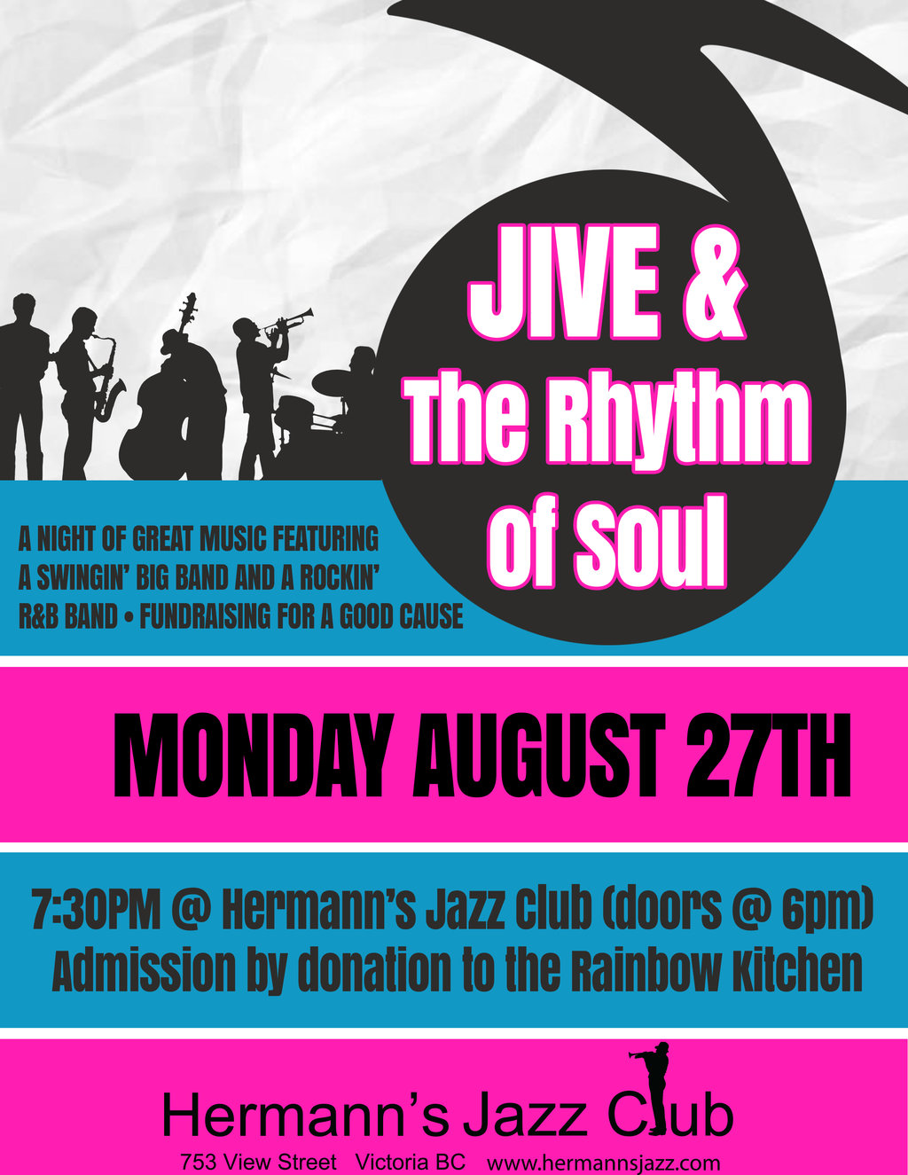 Jive is a community big band led by trombonist Nick La Riviere. The band performs everything from classic big band tunes, to Beatles, movie music, and more. The Rhythm of Soul features the rockin’ R&B stylings of Alli Bean, Lindsay Ward, Ben Groom, and Corey Fenster. The show is by donation to The Rainbow Kitchen, so come on out and support a great cause!