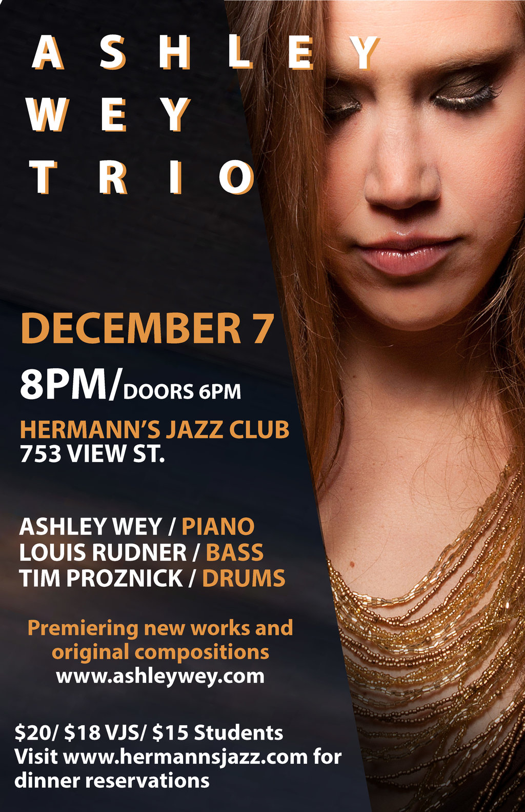 The Ashley Wey Trio will be premiering new works and original compositions, featuring Ashley Wey, piano, Louis Rudner, bass, and Tim Proznick, bass.