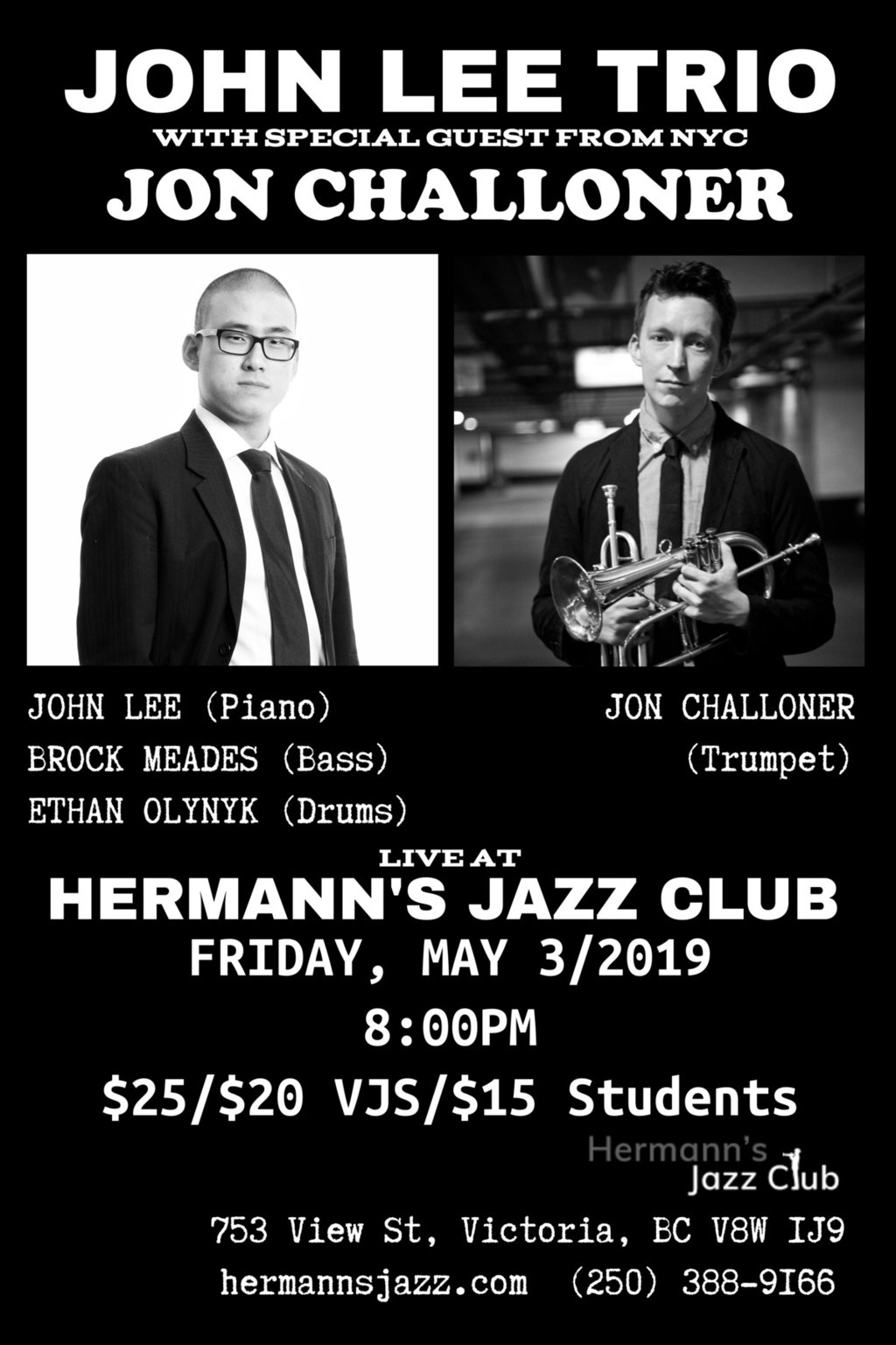 JOHN LEE TRIO presents a concert at Hermann's Jazz Club with special guest from NYC Jon Challoner on the trumpet. Drawing repertoire influence from the Great American Songbook and beyond, this quartet brings new life to old songs while finding a contemporary yet traditionally rooted sound in their improvisational interpretations.