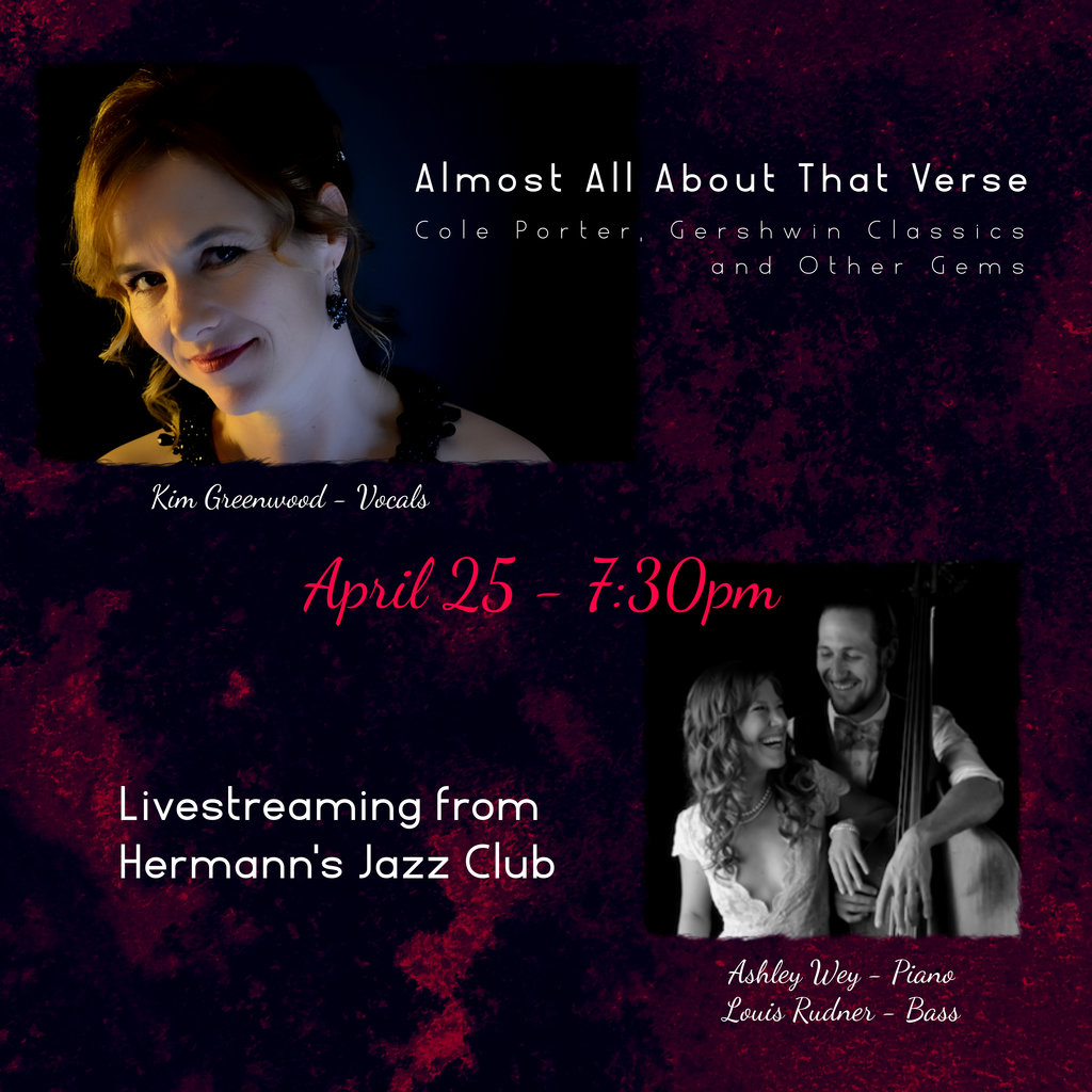 "Almost All About That Verse"...... Streaming from Hermann's to the world!.... Kim Greenwood (vocals), Ashley Wey (piano), and Louis Rudner (bass) are excited to perform mostly American Songbook classics with an emphasis on Cole Porter and Gershwin. Kim will be reprising a few tunes from her sold out fall show "All About That Verse" and adding some more gems.