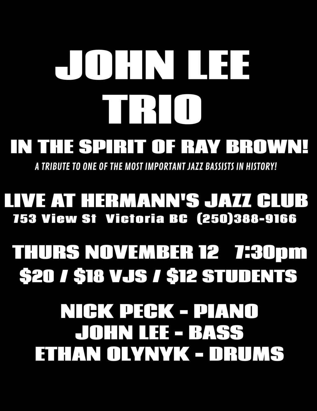 Thu. November 12th 2020 7:30pm - 9:00pm doors at 6:30pm (All Ages) Multi-instrumentalist John Lee makes his debut return to Hermann's Jazz Club as a leader since the COVID Pandemic, performing his classic tribute to the late and great bassist Ray Brown.