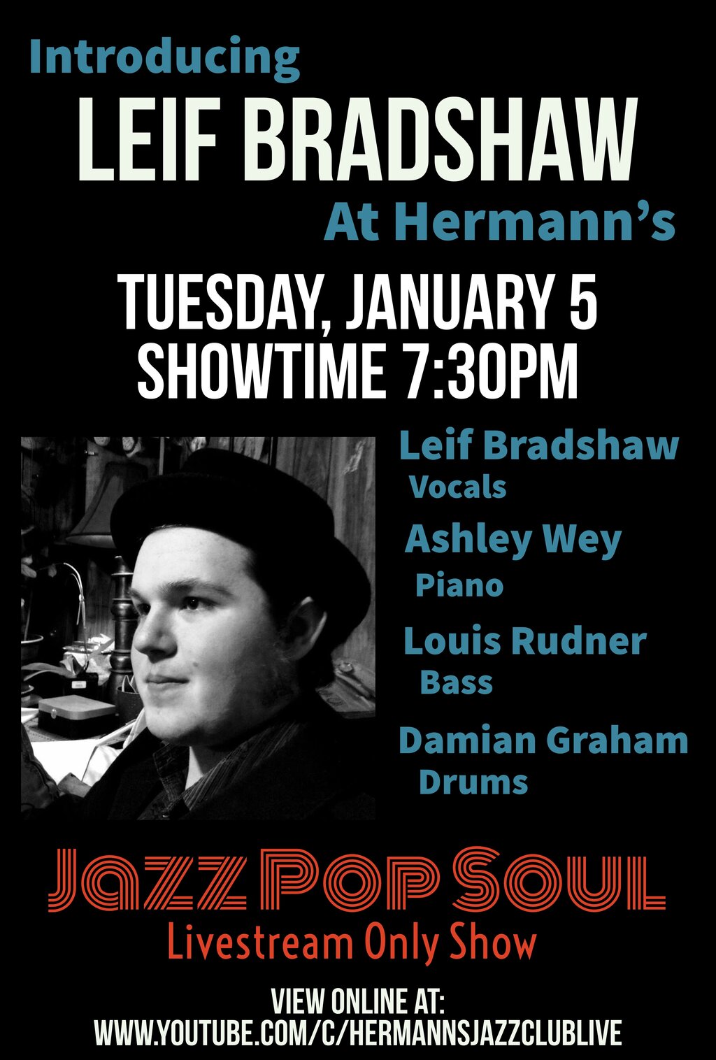 Growing up obsessively consuming music of nearly every genre, and participating in several musical projects in and out of school, Leif Bradshaw was particularly fond of jazz, possibly thanks to his parents choosing Vince Guaraldi instead of Mozart as default lullaby music for their newborn son. This fondness made him quick to seek out Hermann's Jazz Club, upon learning during his college classes about the jam sessions hosted there. Ever since, he would often make a point to drop in to sing, and try to make friends with those in Victoria's jazz scene. Now, after over half a decade of becoming a familiar face to Hermann's, whether as a regular patron, jam session participant, or guest singer with some fabulous local jazz headliners, Leif Bradshaw finally is about to be his own headliner for a show at Hermann's. If you have an evening to spare on January 5th, 2021, tune in to the club's livestream feed, where Leif shall perform a handful of some of his favourite songs suitable for a jazz club, in what will be the start of a good run of shows to come. While this debut as the face of a Hermann's show sadly won't allow an in-person audience, this is nonetheless an exciting opportunity for Leif to advertise what to expect in future performances, when in-person audiences can happen again. In the meantime, sit back, relax, and prepare for a livestreamed jazzy welcome to the first full week of the New Year with Leif Bradshaw, along with the talents of Ashley Wey on piano, and Louis Rudner on bass.