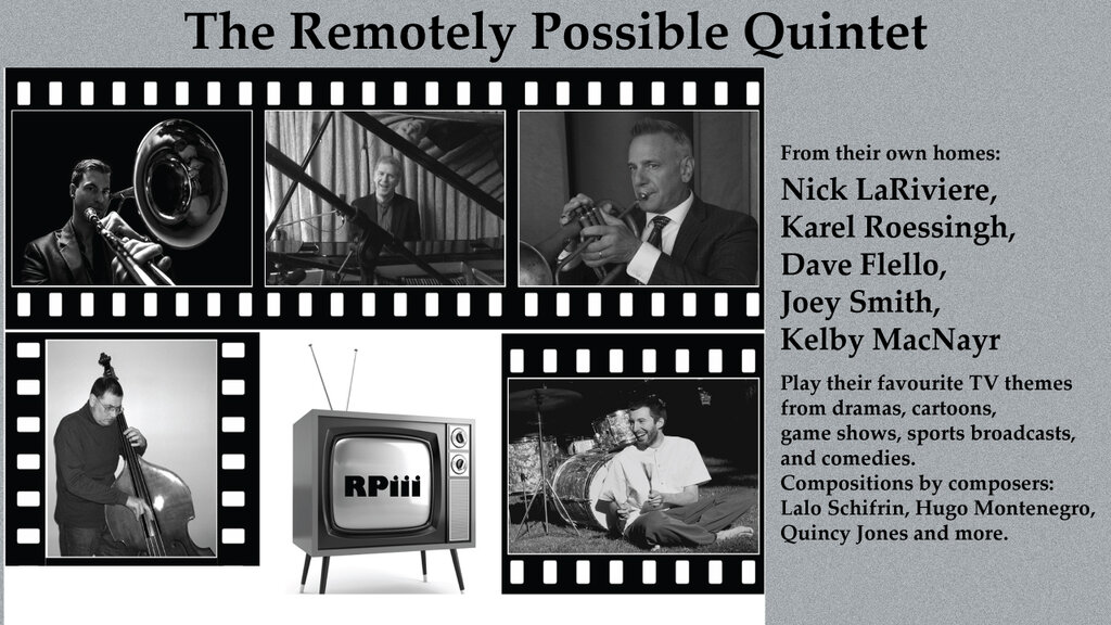 Tue. April 6th 2021 7:00 pm - 8:30 pm (All Ages) The Remotely Possible Quintet, with Nick LaRiviere, Dave Flello, Kelby MacNayr, Joey Smith, and Karel Roessingh play their favourite TV themes from dramas, cartoons, game shows, sports broadcasts, and comedies, written by the best-known television and film composers from Lalo Schifrin to Hugo Montenegro to Quincy Jones.