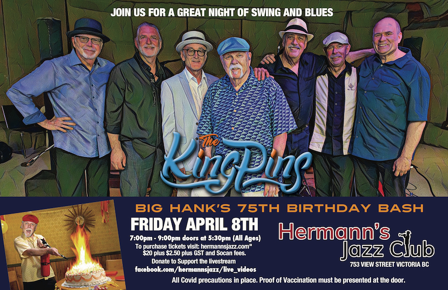 Fri. April 8th 2022 7:00 - 9:00 doors at 5:30 (All Ages) The Kingpins have been performing their brand of original high energy R&B dance music since 2003 and show no signs of stopping. Fronted by the lion-voiced Big Hank Lionhart and powered by a 7-piece horn-driven rhythm section, this exceptional band will have you up and dancing from the very first tune! Come and swing the night away