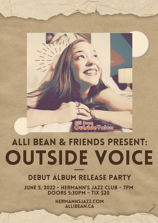 As the pandemic restrictions have eased, Bean has returned to work with her pre-pandemic band mates, Lindsay Ward (Bass), Benjamin James-Groom (Drums), Corey Fenster (Guitar) & Alex Be (Backup Vocals) to present Outside Voice live, in person, for the first time. Alli & her friends would like to cordially invite the public to join them on June 5, 2022 at Hermann's Jazz Club to celebrate her powerful debut as a singer-songwriter.