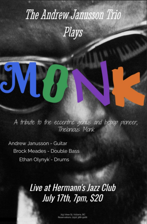 Sun. July 17th 2022 7:00 - 9:00 doors at 5:30 (All Ages) The Andrew Janusson trio rides again! Andrew Janusson brings his young, up and coming trio featuring Brock Meades on Bass, Ethan Olynyk on Drums and himself on Guitar to display their talents using the themes of the eccentric genius and bebop pioneer Thelonious Monk as their musical vehicle. The long-awaited return of the pre-eminent "bebop boys" comes to life this night with the angular and always interesting melodies of Monk's timeless music.