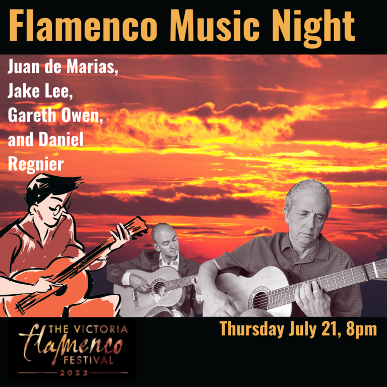 Thu. July 21st 2022 8:00 - 10:00 doors at 6:00 An evening of flamenco music and inspiration! Enjoy the passion and rhythm of Flamenco featuring guitarists, Juan de Marias, Jake Lee, Gareth Owen, and Daniel Regnier in an exciting evening of traditional and innovative flamenco music.