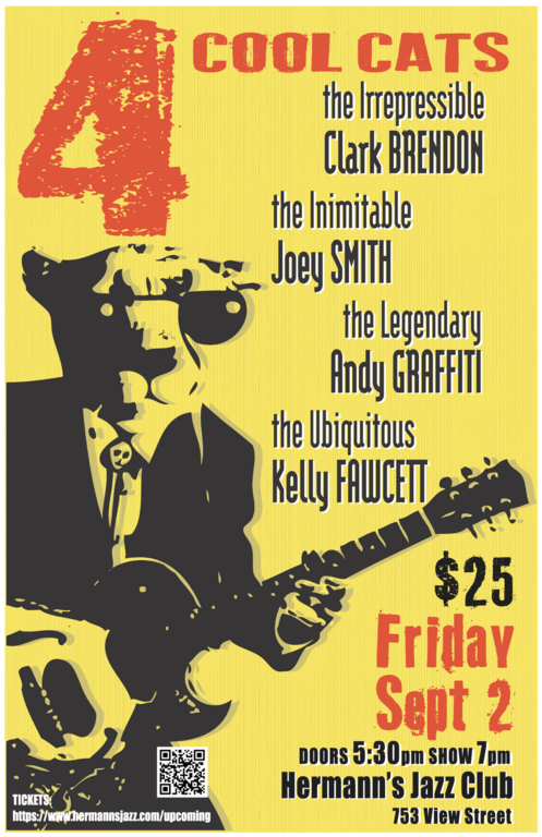 Clark Brendon • Joey Smith • Andy Graffiti • Kelly Fawcett are 4 cool cats who will cover from swing to New Orleans R&B and simply have a lot of fun sharing superb musicianship.