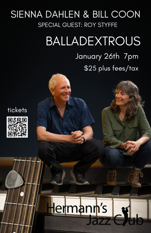 Juno-winning vocalist! and Montreal-based, BC-raised vocalist and composer, Sienna Dahlen and Vancouver-based, QC-raised guitarist and composer, Bill Coon share more than their respective love for these two beautiful Canadian provinces. Having met “on the scene” as they say, their connection was immediate, both musically and personally-speaking. The decision to make a mostly jazz ballads album in January of 2020 resulted from a collective desire to honor the mysterious unfolding of the muse, welcoming both surprise and sure-fire musical navigation, leading and supporting one another in a slow dance through time. “Balladextrous” is the result of that playfully circuitous and soulful journey. Dahlen, a Juno-award winning vocalist and Coon, one of Canada’s treasures on the guitar, look forward to bringing their soothing duo to Hermann’s Jazz Club!