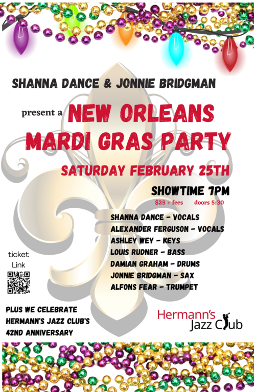 Vocalist Shanna Dance and Saxophonist Jonnie Bridgman present "New Orleans Mardi Gras Party", in Victoria! Shanna and Jonnie are back at Hermann's with a dynamite band for another tribute to the music of New Orleans, this time in honor of Mardi gras. You'll hear and New Orleans Classics in the style of Dr. John, Professor Longhair, Aaron Neville, the Meters, John Cleary, Preservation hall Jazz Band, and many more! The last show at Hermann's by this all-star band was a complete sell-out so get your tickets right away! We encourage the audience members to dress up in full Mardi Gear to make the night more festive. We look forward to celebrating Mardi Gras with you.