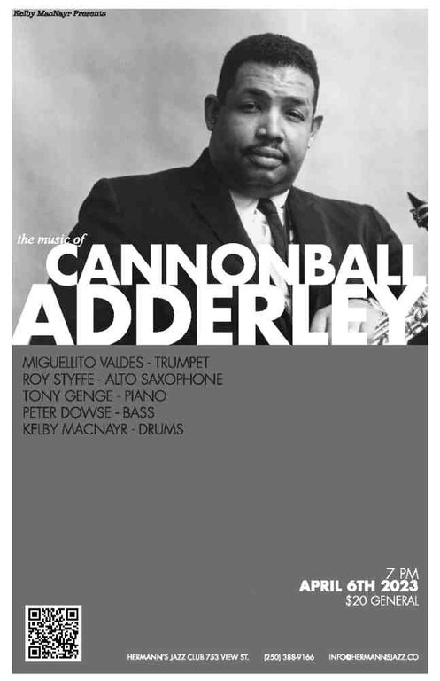 Arguably one of the most artistically and commercially successful small groups of the era, much of the Adderley Brothers material has become lost and forgotten today. In this special presentation, we bring back to life some of the greatest hits and lesser known treasures of the Adderley Brothers repertoire featuring the wonderful saxophonist Roy Styffe, fiery Cuban trumpet virtuoso Miguelito Valdes, swinging piano player Tony Genge, the driving bass of Peter Dowse and the subtle and explosive drumming of Kelby MacNayr!