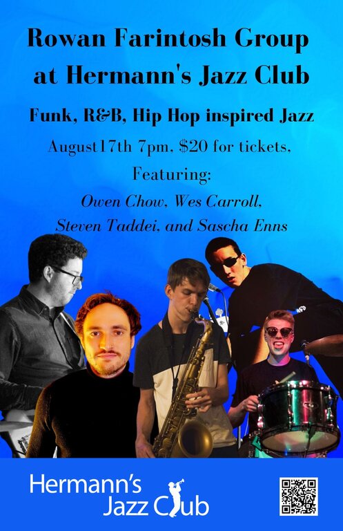 The Rowan Farintosh Group returns to Hermann’s Jazz club on Thursday, August 17th! Rowan Farintosh is back to perform another exciting night of music featuring some of Victoria’s best musicians. Expect to hear instrumental music rooted in jazz improvisation, while borrowing elements from Funk, Hiphop, and other popular genres.