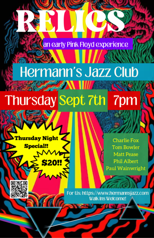 Relics pay homage to the early days of Pink Floyd, focusing primarily on the 1967-1975 period of the band's illustrious career. Songs, like "Astronomy Domine", "Lucifer Sam", "Us and Them", "Wish You Were Here" and "Echoes", from albums such as Saucerful of Secrets, Dark Side Of the Moon, and Meddle, will be featured in a show resplendent with psychedelic lighting and surround sound. All of it made more intimate in the comfortable environment of Hermann's Jazz Club. The kind of thing you might have seen walking into a club in London in the 60's and early 70's!