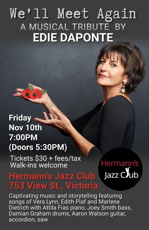Join Edie DaPonte for a special tribute show which has the audience transported to world war 2 to relive the songs of Vera Lynn, Edith Piaf and Marlene Dietrich, the voices that offered comfort and hope to forces and civilians alike. Edie pays homage to their classic songs with celebrated musicians; Attila Fias piano, Joey Smith bass, Aaron Watson guitar/accordion/saw and Damian Graham drums. Through carefully chosen songs, the audience can expect a captivating evening of music and storytelling.