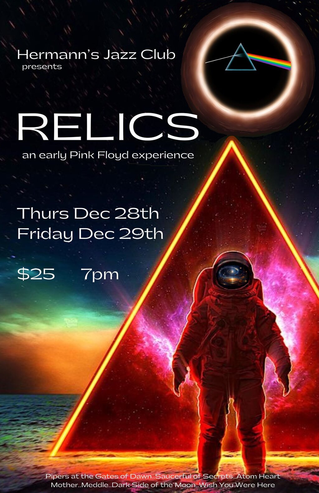 Relics pay homage to the early days of Pink Floyd, focusing primarily on the 1967-1975 period of the band's illustrious career. Songs, like "Astronomy Domine", "Lucifer Sam", "Us and Them", "Wish You Were Here" and "Echoes", from albums such as Saucerful of Secrets, Dark Side Of the Moon, and Meddle, will be featured in a show resplendent with psychedelic lighting and surround sound. All of it made more intimate in the comfortable environment of Hermann's Jazz Club. The kind of thing you might have seen walking into a club in London in the 60's and early 70's!