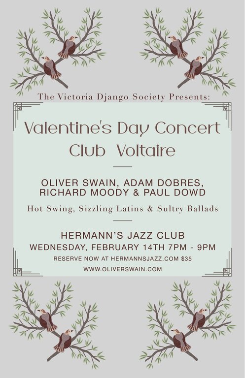 Performing in the style of Django Reinhardt and Stephane Grappelli, popular in the hot clubs of France in the 1920’ & 30’s, Club Voltaire has a Valentine’s set filled with hot swing, sizzling latins and sultry ballads. Stunning instrumentalism and soaring vocals by four of Victoria’s premiere acoustic jazz artists featuring Richard Moody(Violin/Vocals), Adam Dobres(Guitar), Paul Dowd(guitar) & Oliver Swain(Bass/Vocals)