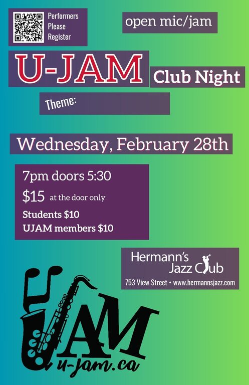 Wed. February 28th 2024 7:00 PM - 9:00 PM doors at 5:30 PM (All Ages) $15.00 non members/ $10 U-JAM members & student